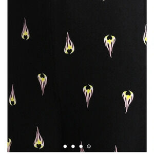 Statement Italian designer jumpsuit from TRUSSARDI JEANS “1987” line. Black crepe-viscose body with the brand’s chartreuse/pink heart-flame micro print. Dramatic sheer cape sleeves, keyhole front & back, and an invisible back zip. Flowing wide-leg cut that reads elegant but cool—easy to dress up with heels or style with platforms for a fashion-editor vibe.