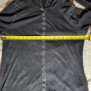 This is a vintage, soft and lightweight black hoodie with a distressed look. 100% cotton. Great to wear alone or with layers. No need to freak out over the amount of buttons— they're easy snaps! And all those snappy buttons make this a versatile garment. It looks cool worn with a few buttons undone from the bottom. Or wear however you like! Lots of choices! Good condition. No obvious flaws beyond a possible loose thread. All buttons intact and functional. Smoke free home.