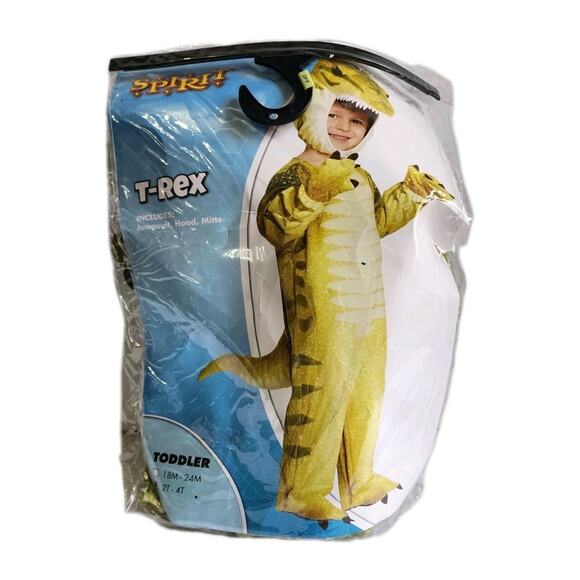 This T-Rex costume for toddlers in size 2T/4T is a fun and unique outfit for Halloween or dress-up play. The green and yellow jumpsuit features a dinosaur theme T-Rex, making it a playful and eye-catching choice for young children. Made from durable polyester material, this unisex costume from Spirit is designed to be comfortable and easy to move in, perfect for active toddlers who love to play pretend. The complete outfit includes everything needed for a cute and festive look.