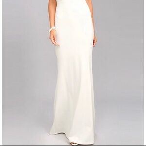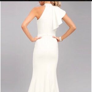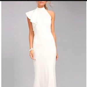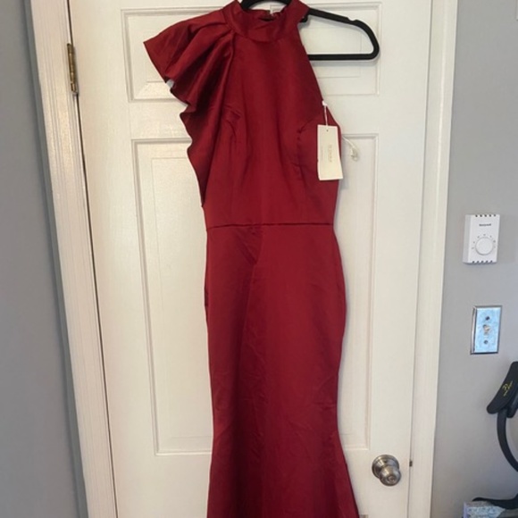 TS COURTURE brand new with tags, no damage, no flaws....., size 4 , Burgundy (white only to show on model) Original price $240. Polyester satin , hand washable. It has a halter neckline with one shoulder having a flirty ruffle