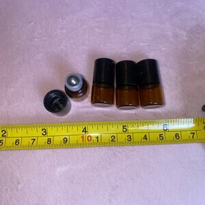 Lot of new amber glass roller bottles and clear plastic containers for traveling or organizing. The amber glass protects cosmetic ingredients from the sun to prevent expiration.