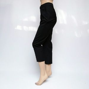 Excellent condition! This is a lovely pair of unlined black capris by TSE! They have a flat front, front zip, and decorative (non-functional) pockets. The fabric is in excellent condition, and I could find no signs of wear other than the fabric info tag being cut out. I believe they are polyester, as they are too thin to be wool. They have a 36.5" outseam, 25.5" inseam, 11" rise, 7.5" cuff, and measure 16.6" across the top.