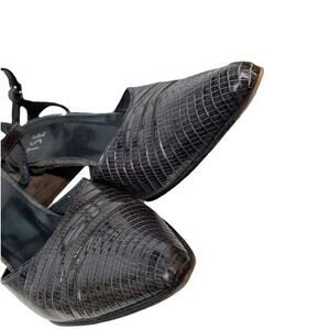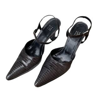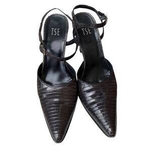 TSE Women Brown Patent Snake Skin Pointed Toe Ankle Buckle Heeled Pumps Sz 38