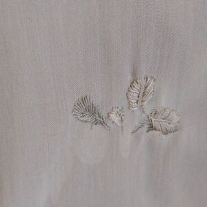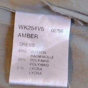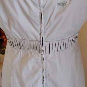 Soft taupe oatmeal color in a handkerchief weight cotton. Fully lined. Back zip. The fit and flare shape is crisp and flattering. The waistband is finely pleated finished with a raw edge. A small flaw in the fabric is pictured , but doesn't detract. The hem is also a raw edge. Size 6 measures 38 at chest, 30 at waist, 40 at hips. 41 long from shoulder to hem. A perfect dress for warm weather. Have fun accessorizing this one.