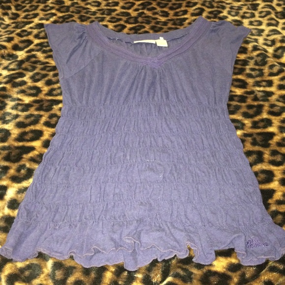 Dark blue, ruffled at the end, stretchy, V-neck