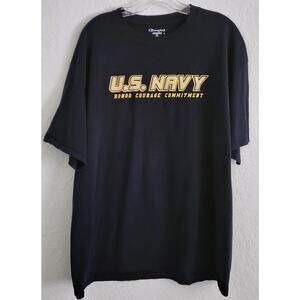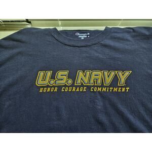 Nice navy blue T-shirt with "U.S. Navy" "Honor Courage Commitment" in yellow on the front. It is plain on the back. It is SIZED XL. Nice clean shirt to honor the U.S. Navy.