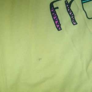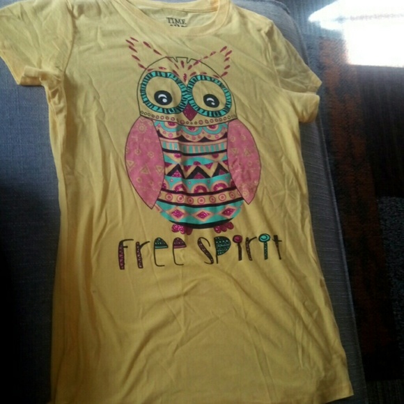 Yellow T-shirt with owl design and "Free Spirit" on front. Blank back. Small black stain on front. 60% cotton, 40% polyester.