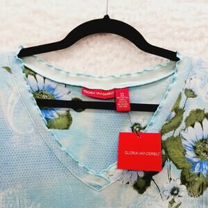Channel soft new with tags, garden-inspired charm with this brand new Gloria Vanderbilt tee featuring delicate blue gerbera daisies blooming over a swirling paisley background. The lightweight 100% cotton knit offers breathable comfort, while the lettuce-edge trim at the V-neck and cuffs adds a playful, feminine finish. A relaxed fit and long sleeves make it ideal for layering or lounging in style.