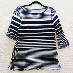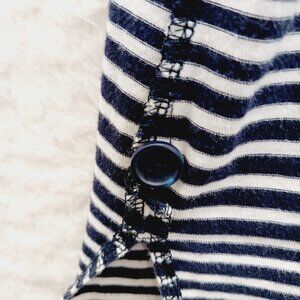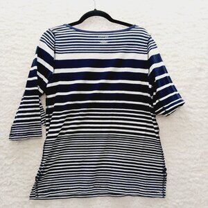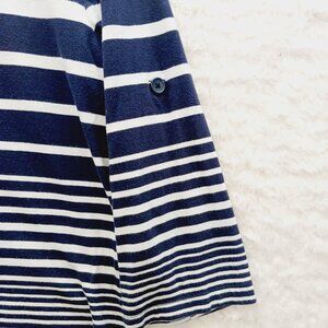 Classic and crisp, this navy and white striped top by St. John’s Bay features 3/4 sleeves with roll-tab detail, a round neckline, and side slits for ease of movement. Made from soft 100% cotton, it’s a timeless piece perfect for layering or wearing solo on breezy days by the water or weekend strolls.