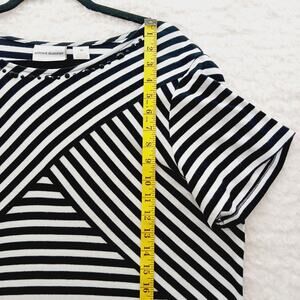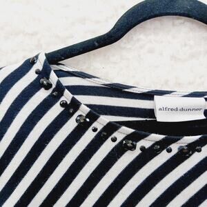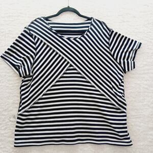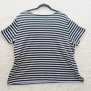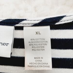 Alfred Dunner, Navy White Striped, Diagonal Overlay Tee, Cotton Blend, Short Sleeve, Size XL, Side Slits, Nautical Style, Sailor-Inspired Top