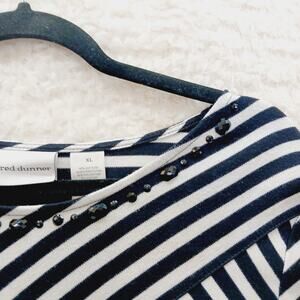 Classic stripes with a twist—this navy and white short sleeve tee features a unique diagonal overlay detail at the front for a flattering, elevated look. Crafted from a breathable cotton-poly blend, this Alfred Dunner top is soft, comfy, and full of style. Finished with side slits for movement and a relaxed fit. Pre-owned in excellent condition. Size XL.