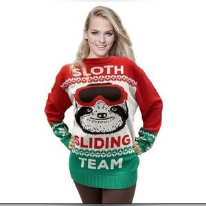 Ugly Christmas Sweater Sloth Sliding Team Office Party Sz Large Winter Festive Embrace the holiday spirit with this vibrant red and green sloth sweater. Perfect for adding a playful touch to your winter wardrobe.