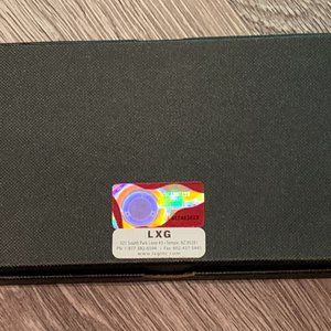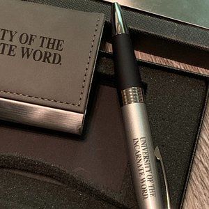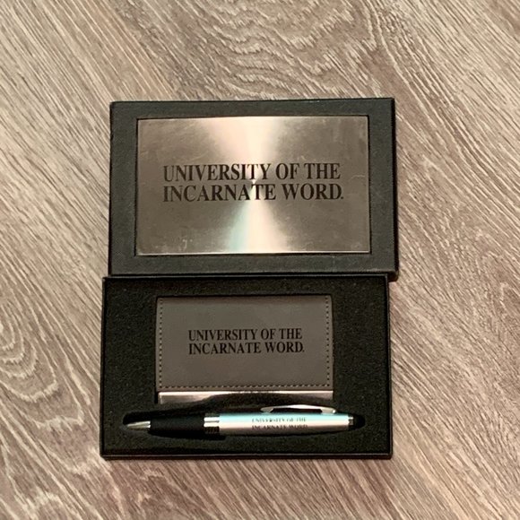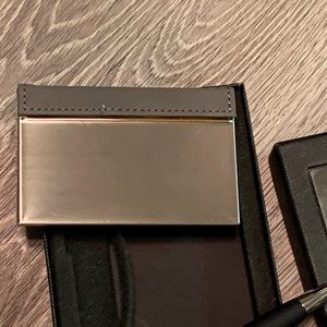 Top of the box is unglued and box plate is smeared, can be rehabbed for use. Card case and pen are in perfect condition.
