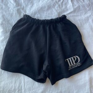 Ink black sweat shorts featuring gray "TTPD" album logo and "The Tortured Poets Department" printed on wearer's left leg. Drawstring waist and side pockets. Never worn, just a little too small on me but so comfy 🥰