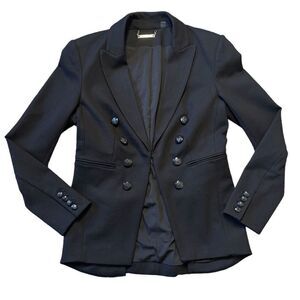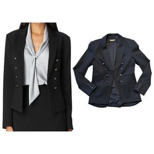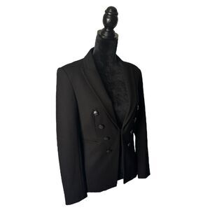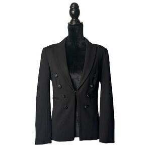 T Tahari Black Blazer. Sophisticated peak lapels meet a double breasted jacket for with front Lay flat welt pockets for a refined, elegant style. Absolutely perfect for dressy casual occasions. Features a refined military style look. Structured. Decorative buttons and single hook closure. True to size fit. Long sleeves. Solid black color. Fully Lined. 67% rayon, 29% nylon, 4% spandex. Lining: 100% polyester. Measurements in pictures.