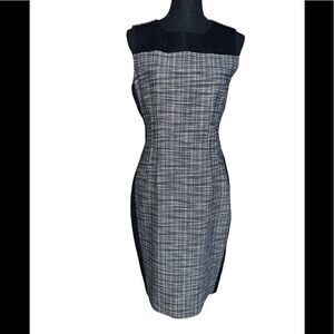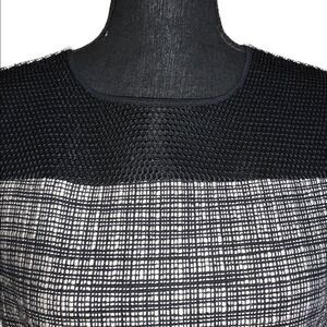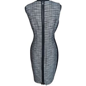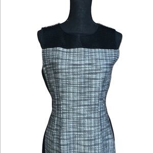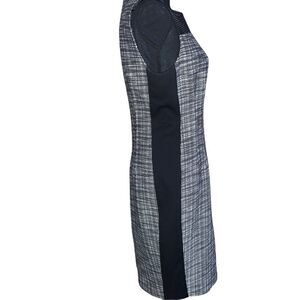 Black and white tweed dress. Upper mesh design. Sleeveless. Full back zip closure. Fully lined. Hits at knee. Shell: 100% cotton. Side panels: 78% polyester/18% rayon/4% elastane. Front yoke: 100% polyester. Lining: 97% polyester/2% elastane. Size: 6. Preowned in good condition. Only worn once.