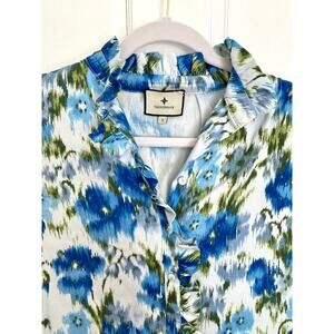 Tuckernuck Tate Ikat Blue Green Mini Ruffle Pleated Cotton Poplin Shirt Dress S