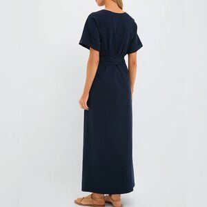 The Navy Clarissa Maxi Dress features a relaxed silhouette with a removable self-tie belt for a flattering fit.