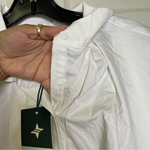 a stand collar, partial front button closure, and pleating along the shoulders, this classic silhouette can be worn over and over again. Pair with ballet flats for the office, or with denim and sneakers for a casual day out and about.