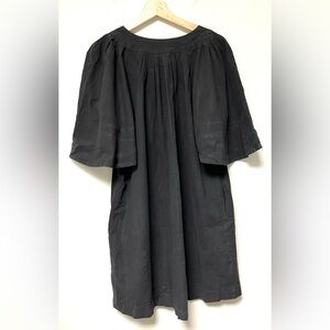 Pomander Place dress, black cotton dress, size large, flutter sleeve dress, short sleeve dress, babydoll style, pleated front detail, relaxed fit dress, V-neck dress, shift dress, casual dress, 100% cotton, lightweight summer dress, knee-length dress, versatile black dress, everyday wear, minimalist style, trendy black dress, classic silhouette, breathable fabric, comfy chic, dress with movement, solid black, easy wear dress.