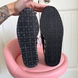 These Hello Kitty creepers are NICE yall. These are great quality, well-made, heavy shoes. I tend to love the quality of TUK and when they did a Hello Kitty release back in the day, I was ON IT. These are absolutely precious and in great shape!! They feature the classic Hello Kitty pink bows and heart clasps for the laces, which are a satiny pink ribbon... SUCH a cute little touch. I love that each shoe has it's own design. One side says HELLO! and the other has the outline of Hello Kitty's iconic head and bow. Totally presh. The black and white stripes give it a fun circus feel which makes me very happy too. I hope someone out there will enjoy these shoes as much as I did! Size 9