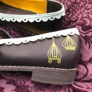 Extreme sweetness!! These older TUKs are in good preloved condition, see photos of wear. Honestly, I didn't even know they were marked up until I brought them down to photograph. Lovely Tiffany Blue agains black with antique birdcage design in yellow to match eyes & beak :).