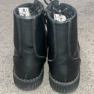 Stomp it out in sharp street style with these killer creeper boots. Features a sleek all black upper made of our vegan friendly high quality TUKskin™ material — polishable synthetic faux leather that is both soft and breathable. These pointed toe booties have a 7-eyelet lace up detail and a platform sole height that measures 1 ¼” at the heel and ¾” in the front. Has removable memory foam insoles for added comfort and inside zipper closure for easy on/off.