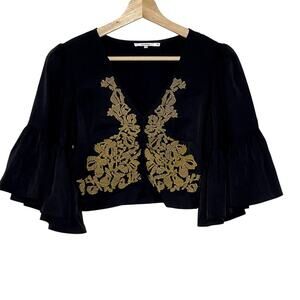 TULAROSA BLACK BELL SLEEVE GOLD EMBROIDERY CROP TOP SIZE XXS. Boho Gold Embroidery Cropped Bell Sleeves Side Zip.