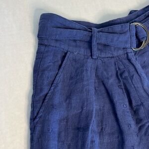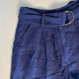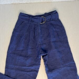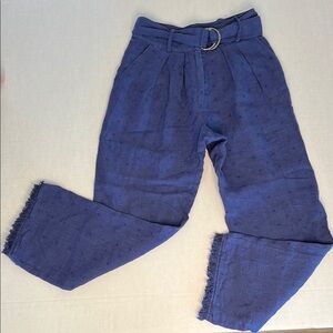 Women’s Tularosa blue 100% linen raw hem pleate front belted pants. Size XS. Inseam 26”. Please look at all pics and comment below with any questions.