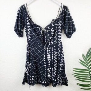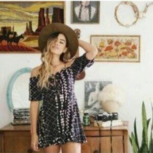 Light weight, black & white boho mini dress, relaxed body with off the shoulder design. A great cover up for the summer!