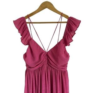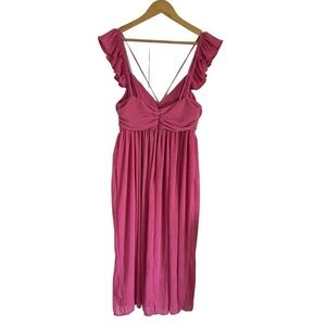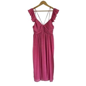 TULAROSA x REVOLVE Katrina Midi Dress in Ibis Rose. Fully lined. Hidden back zipper closure. Ruched bust with sweetheart neckline. Flutter sleeves. Flowy fabric with ruffle hem.
