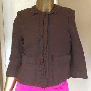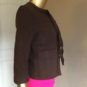 Fantastic designer Tuleh jacket! Collarless 3/4 sleeve jacket with a short cut. Brown wool blend fabric, Patch Pockets & oversized Snap Closures. Self Tie at neck. Partially lined a Tuleh branded fabric. Princess seams. two small pleats in back, seams edges inside finished with trim (nice couture touch!)