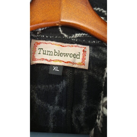 Embrace the cooler weather with the TUMBLEWEED Women's Wool Vest, a perfect blend of style and warmth for your fall and winter wardrobe. The vest features a sophisticated black striped pattern with an embroidered, textured design that adds a touch of bohemian flair. Tailored for a comfortable, regular fit in size XL, this vest is crafted from soft, breathable wool, making it an ideal choice for business, casual wear, or travel. This versatile, single-breasted vest comes with a belted design for a flattering silhouette and a collar that elevates its classic look. It's lightweight yet warming, ensuring you stay comfortable without compromising on style. The vest is easy to care for with a dry clean only requirement, maintaining its quality and texture. Whether layering for a crisp autumn day or adding a cozy layer to your work ensemble, this TUMBLEWEED vest is a timeless addition to any outfit. PTP 21 in. Length 27 in.
