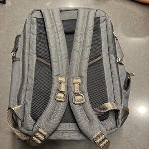 Features multiple compartments, including a padded pocket for 15-inch laptop and a waterproof pocket for a water bottle or an umbrella.