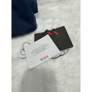 The design includes a front zippered pocket for quick-access items, a roomy interior for daily essentials, and reinforced bottom corners for extra durability. A TUMI luggage tag with logo detail completes the look, emphasizing the brand’s focus on timeless quality.