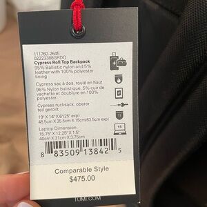 TUMI Cypress Roll Top Black and Gray Backpack with Red Accent - NWT