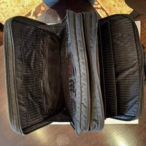 TUMI - Executive expandable Laptop Briefcase. $ 88.00. Value new $950. Three sections. Middle for Laptop /devices. Side one has expandable pockets for files, Side two organize space for multiple items. Numerous pockets on inside and outside. Ballistic material assures this will last for many years ahead. All elements in great shape. Zippers, seams, pockets, separators, handles all in great condition.