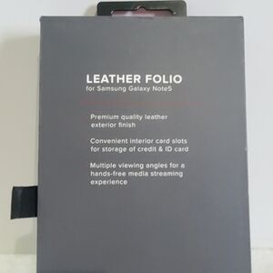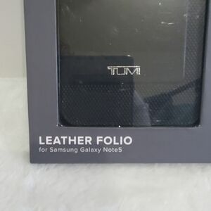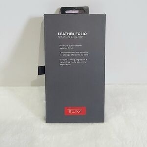 NWT TUMI Samsung Galaxy Note 5 Leather Folio Case With 2 Credit Card Slots. Black with premium leather exterior finish, 2 convenient interior card slots for dollar bills, cards or ID, snap on design provides superior protection & a secure fit, multiple viewing angles for a hands free media streaming, hard shell exterior frame with a soft interior lining to protect your device. Approximately 3" X 6" case.