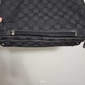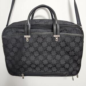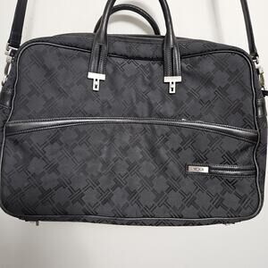 Crafted for the professional on the move, this TUMI Signature Collection briefcase/laptop bag blends timeless style with functional design. The sleek black nylon and leather construction ensures durability, while the all-over pattern exudes a sense of sophistication. It's a perfect accessory for someone who appreciates both form and function in their daily commute. The bag is designed to accommodate a 14-inch laptop, with multiple partitions to keep your devices and accessories organized. Additional features such as water resistance, dustproofing, and padded compartments offer protection against the elements, ensuring your equipment stays safe and secure. The comfortable shoulder strap and convenient dimensions (12 inches in height, 16 inches in length, and 4 inches in width) make it a practical choice for those who are always on the go.