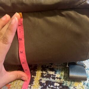 It is in fair conditions, has some marks of wear as seen in photos, one flaw on the strap but is not loose or anything, and one of the zippers metal pull is missing.