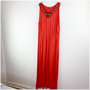 super comfortable jersey with and elastic waist, this TU orange sleeveless maxi dress can take you from lounging, to a party or to the pool. Lovely flattering flowing design. Gold beading and black sequins add an exotic boho flair. Please see photos for additional details. Pit to Pit 20“ Length from waist 40”