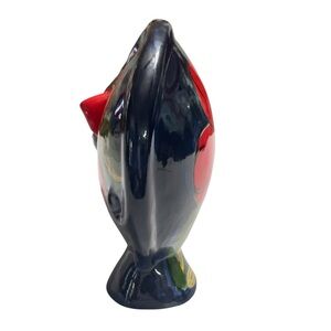 Featuring a glossy deep navy blue glaze adorned with vibrant red flowers and green leaves on both sides, this collectible piece is a whimsical blend of folk art and functional