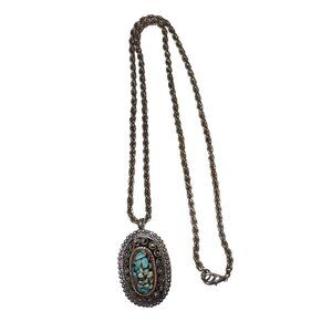TURQUOISE CHIP MOSAIC PENDANT ON A SILVERTONE 24" JEWELRY NECKLACE