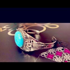 An oblong turquoise stone is pressed into the center of a textured silver frame attached to the studded ends of layered silver bands, creating a colorful rustic centerpiece atop the finger. Features a stretchy band for a flexible fit.
