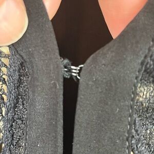 The v-neck line plunges and can kept together with two sewn in hooks or worn with just one or no hook. Very pretty metallic detailing around neckline.