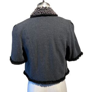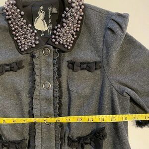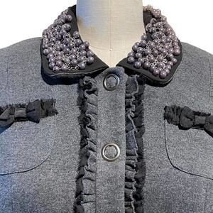 Retro charcoal gray cotton jacket with ruffle trim & bows, pearl & silver chain collar, Short sleeves, Snap closure, 4 front pockets.