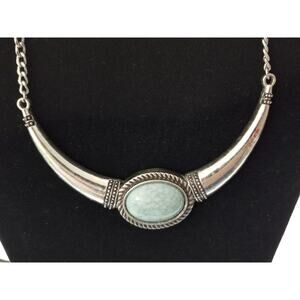 Add a touch of bohemian chic to your look with this stunning twelve inch necklace featuring a large blue stone centerpiece. The unique choker style and turquoise main stone color make this piece a must-have for any fashion jewelry collection. The stone is crafted from high-quality natural materials and set on a metal chain that adds a subtle touch of shine. This necklace is perfect for any occasion and will add a touch of elegance to any outfit. n130