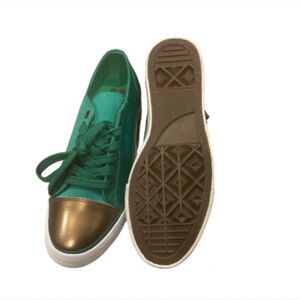 Twiggy London Green Satin Gold Leather Metallic Toe NWOT Size 6.5 W No box #454