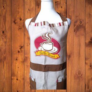 Mainstays beige full apron has two brown pockets, brown straps and says "Coffee Break" on the front with a cup of steaming coffee. It ties at the neck and in the back. The measurement from end of waist strap to end of waist strap is 68 inches. Each strap is 21 inches and the apron is 27 inches. The straps at the neck are 20 inches from the top of apron to end of strap.