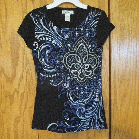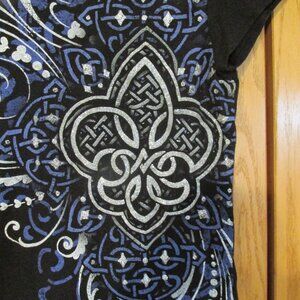 TWISTED COURTESY WOMEN'S JUNIOR'S SIZE S (3 / 5) T-SHIRT BLACK SILVER GLITTER CELTIC GRAPHIC TOP. Fabric: 100% Cotton. Dark periwinkle, gray with silver glitter Celtic graphic design on black t-shirt. Black ribbing crew neck. Cap sleeves. Top pulls on over the head. The pictures show the exact item you are purchasing. ** Color may be slightly off due to monitor color setting/flash of camera **.